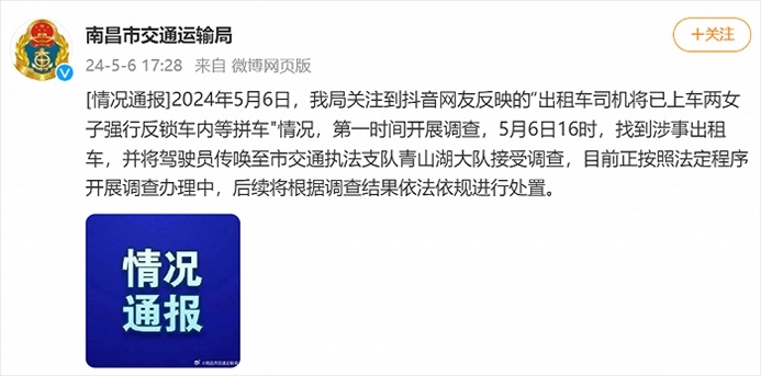 ·網(wǎng)友稱(chēng)出租車(chē)司機(jī)將兩女子反鎖車(chē)內(nèi)等拼車(chē),南昌市交通運(yùn)輸局回應(yīng)。