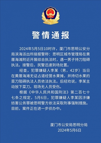 ·廈門(mén)警方:無(wú)證占道經(jīng)營(yíng)還持刀阻礙執(zhí)法,一男子被采取刑事強(qiáng)制措施。