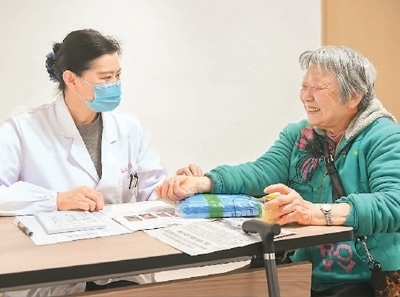 安徽省合肥市廬陽區(qū)養(yǎng)老服務指導中心與安徽中醫(yī)藥大學門診部(國醫(yī)堂)醫(yī)聯(lián)體合作揭牌,該醫(yī)聯(lián)體開設中醫(yī)科門診,助力老年群體樂享健康的晚年生活。圖為安徽中醫(yī)藥大學門診部(國醫(yī)堂)專家(左)為廬陽區(qū)老年人義診治療。袁 兵攝(人民圖片)