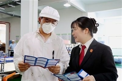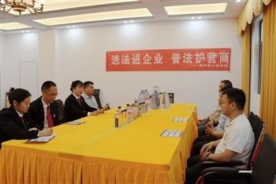 圖②:法官對(duì)食品廠工作人員現(xiàn)場(chǎng)普法。