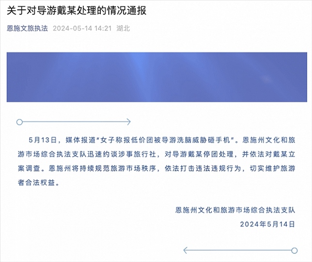 央視網(wǎng)消息:湖北恩施州文化和旅游市場綜合執(zhí)法支隊5月14日通報,5月13日,媒體報道“女子稱報低價團被導游洗腦威脅砸手機”。恩施州文化和旅游市場綜合執(zhí)法支隊迅速約談涉事旅行社,對導游戴某停團處理,并依法對戴某立案調查。恩施州將持續(xù)規(guī)范旅游市場秩序,依法打擊違法違規(guī)行為,切實維護旅游者合法權益。