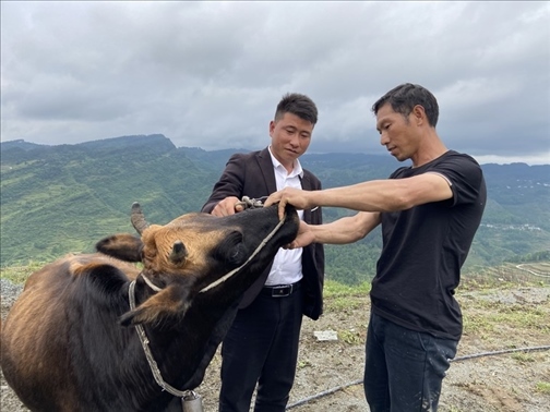 楊勝強(qiáng)(左)同養(yǎng)殖戶一起查看牛的年齡(2022年10月13日攝)。新華社發(fā)(張倩秋 攝)