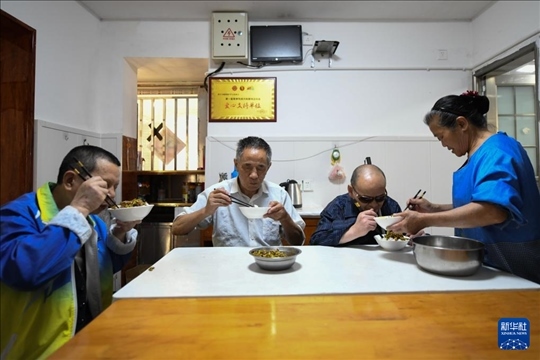 5月13日,在出發(fā)前往周年慶前,張世維(左一)和協(xié)會(huì)會(huì)員在家里吃早飯。新華社記者 胥冰潔 攝