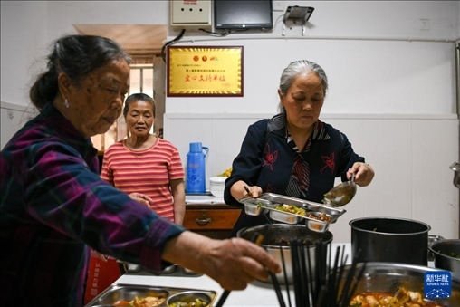 4月15日,馮懿蘋(右)與成都視障者互助協(xié)會(huì)家屬志愿者為樂(lè)隊(duì)成員準(zhǔn)備午飯。新華社記者 胥冰潔 攝