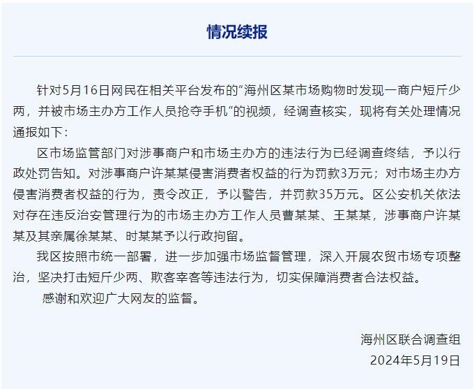 央視網(wǎng)消息:據(jù)“今日海州”微信公眾號(hào)消息,針對(duì)5月16日網(wǎng)民在相關(guān)平臺(tái)發(fā)布的“海州區(qū)某市場(chǎng)購(gòu)物時(shí)發(fā)現(xiàn)一商戶短斤少兩,并被市場(chǎng)主辦方工作人員搶奪手機(jī)”的視頻,經(jīng)調(diào)查核實(shí),現(xiàn)將有關(guān)處理情況通報(bào)如下:區(qū)市場(chǎng)監(jiān)管部門(mén)對(duì)涉事商戶和市場(chǎng)主辦方的違法行為已經(jīng)調(diào)查終結(jié),予以行政處罰告知。對(duì)涉事商戶許某某侵害消費(fèi)者權(quán)益的行為罰款3萬(wàn)元;對(duì)市場(chǎng)主辦方侵害消費(fèi)者權(quán)益的行為,責(zé)令改正,予以警告,并罰款35萬(wàn)元。區(qū)公安機(jī)關(guān)依法對(duì)存在違反治安管理行為的市場(chǎng)主辦方工作人員曹某某、王某某,涉事商戶許某某及其親屬徐某某、時(shí)某某予以行政拘留。