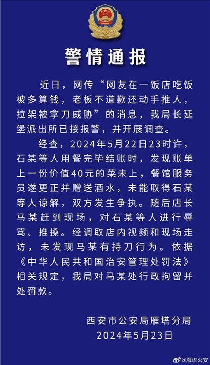 ·網(wǎng)友稱在飯店吃飯被多算錢還遭威脅,西安雁塔警方通報(bào)。