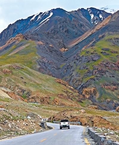 喀喇昆侖公路穿越巍峨險峻的喀喇昆侖山脈,大量路段位于高寒山地,地質(zhì)條件復(fù)雜,修建橋梁和隧道的工程難度大、危險性高。公路沿線有多處巴方設(shè)立的紀念地標,傳承兩國友誼。圖為一輛汽車行駛在喀喇昆侖公路上。本報巴基斯坦分社 賽義德·邁赫迪攝