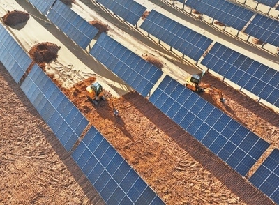 庫(kù)布其沙漠鄂爾多斯中北部新能源基地先導(dǎo)工程項(xiàng)目現(xiàn)場(chǎng),挖掘機(jī)進(jìn)行覆土作業(yè)。