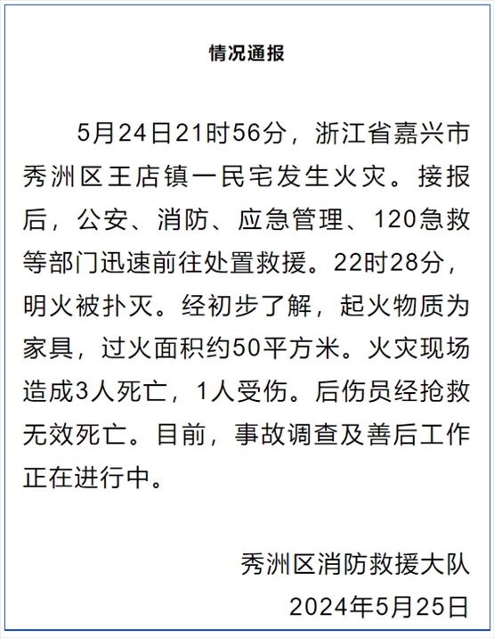 經初步了解,起火物質為家具,過火面積約50平方米。火災現場造成3人死亡,1人受傷,后傷員經搶救無效死亡。目前,事故調查及善后工作正在進行中。