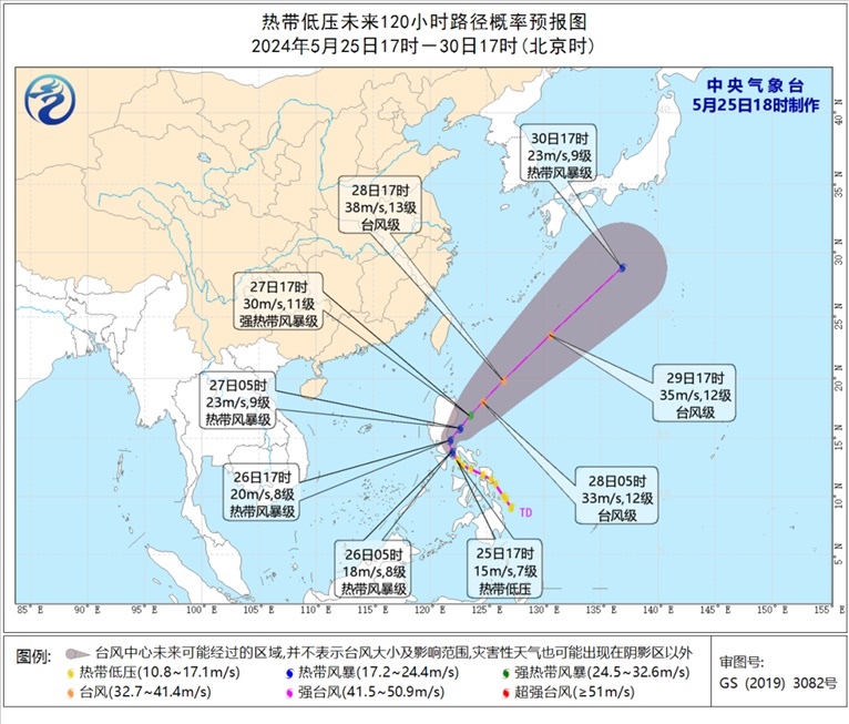 再看看菲律賓附近熱帶低壓,其中心今天下午5點(diǎn)鐘位于菲律賓馬尼拉東南方大約225公里的菲律賓群島中部,預(yù)計(jì)將于未來12小時(shí)內(nèi)加強(qiáng)為今年第1號臺風(fēng),明后天將在菲律賓呂宋島東部海面逐漸轉(zhuǎn)向東北方向移動。