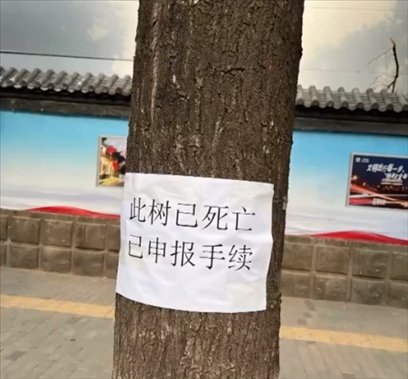 ·北京市民拍到一棵樹上貼著“死亡通知”,園林局工作人員:系正在等待砍伐許可的枯木。