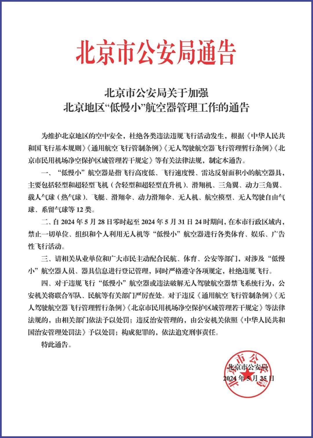 央視網消息:據(jù)“首都治安微提示”公眾號消息,5月25日,北京市公安局發(fā)布了《北京市公安局關于加強北京地區(qū)“低慢小”航空器管理工作的通告》,其中明確:自2024年5月28日零時起至2024年5月31日24時期間,在北京市行政區(qū)域內,禁止一切單位、組織和個人利用無人機等“低慢小”航空器進行各類體育、娛樂、廣告性飛行活動。