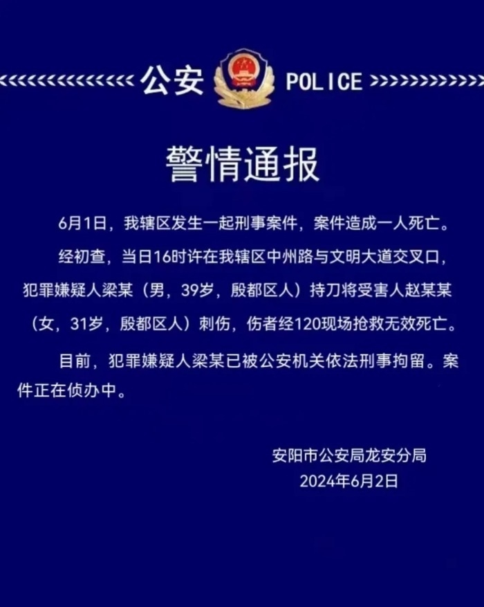 央視網(wǎng)消息:河南安陽市公安局龍安分局6月2日發(fā)布警情通報:6月1日,轄區(qū)發(fā)生一起刑事案件,案件造成一人死亡。經(jīng)初查,當日16時許在轄區(qū)中州路與文明大道交叉口,犯罪嫌疑人梁某 (男,39歲,殷都區(qū)人)持刀將受害人趙某某(女,31歲,殷都區(qū)人)刺傷,傷者經(jīng)120現(xiàn)場搶救無效死亡。目前,犯罪嫌疑人梁某已被公安機關依法刑事拘留。案件正在偵辦中。