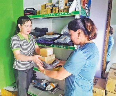 圖為斯衣提尼沙(右)在快遞服務(wù)站取快遞。