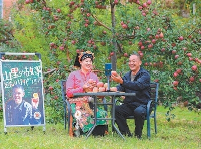 四川省小金縣沃日鎮(zhèn)木欄村,電商主播同果農(nóng)一起直播賣(mài)蘋(píng)果。嚴(yán)易程攝(人民視覺(jué))