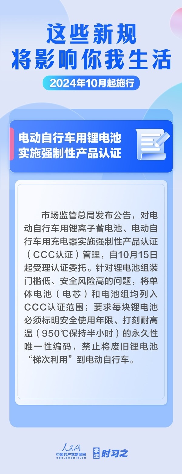 增加軍人撫恤優(yōu)待措施;全鏈條規(guī)范養(yǎng)老機(jī)構(gòu)收費(fèi)行為;電動(dòng)自行車用鋰電池實(shí)施強(qiáng)制性產(chǎn)品認(rèn)證……10月起,這些新規(guī)施行,將影響你我生活。