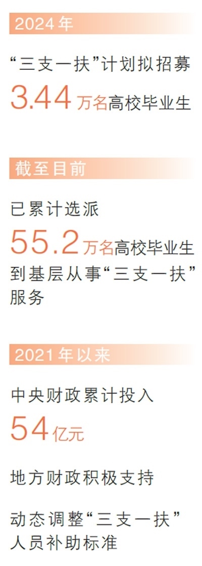 在奮斗中書(shū)寫(xiě)青春華章,在奉獻(xiàn)中成就事業(yè)。2006年“三支一扶”計(jì)劃開(kāi)展以來(lái),50多萬(wàn)名高校畢業(yè)生扎根鄉(xiāng)村,開(kāi)展支教、支農(nóng)、支醫(yī)等服務(wù)。2024年,“三支一扶”計(jì)劃擬招募3.44萬(wàn)名高校畢業(yè)生到基層開(kāi)展相關(guān)服務(wù)。