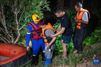 凌晨2時許,記者在決口現(xiàn)場看到,由于道路狹窄,通行不便,消防隊員扛著救生艇向受災(zāi)區(qū)域挺進,不斷有受災(zāi)群眾乘坐救生艇被轉(zhuǎn)移至安全地帶。