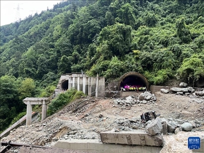 這是雅康高速四川甘孜藏族自治州康定至瀘定段日地1號(hào)隧道至2號(hào)隧道隧間橋垮塌現(xiàn)場(chǎng)(8月3日攝)。新華社發(fā)