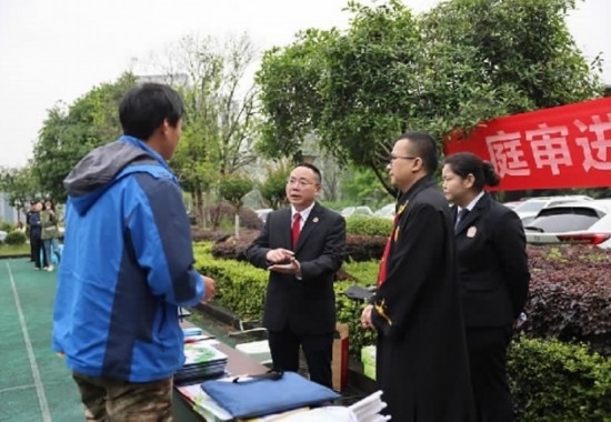 圖為重慶市渝北區(qū)人民法院在一起到企業(yè)現(xiàn)場(chǎng)開庭的勞動(dòng)爭(zhēng)議案結(jié)束后,為勞動(dòng)者普及法律知識(shí)、提供法律咨詢。 劉霞 攝