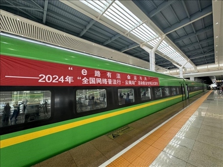 人民網(wǎng)昆明8月22日電 (孝金波、高清揚(yáng))今日,2024年“全國網(wǎng)絡(luò)普法行·云南站”活動在昆明啟動。作為活動的一大亮點(diǎn),在昆明南站始發(fā)的“e路有法 命運(yùn)與共”普法專列滿載著法律知識,沿著中老鐵路這一國際大通道,為乘客們打造了別開生面的普法之旅。