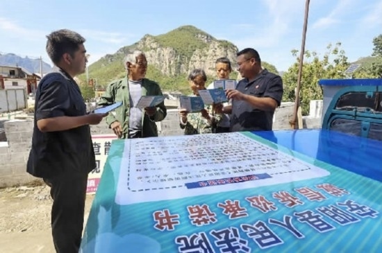 湯陰縣法院駐村法官在社區(qū)調解糾紛。