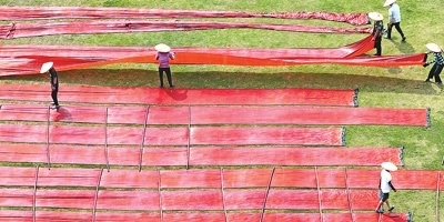 3月26日,廣東省佛山市順德區(qū)一香云紗產(chǎn)研文化基地的工人,利用晴好天氣抓緊時(shí)間曬香云紗。王國(guó)榮攝(人民圖片)