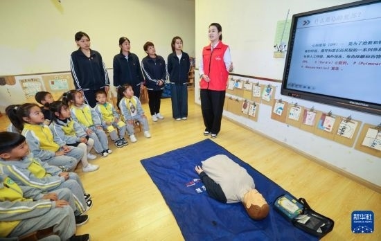10月22日,國網(wǎng)浙江湖州供電公司“救”在身邊志愿服務(wù)隊(duì)的黨員志愿者梅月圓(右一)在長興縣開發(fā)區(qū)中心幼兒園開展應(yīng)急救護(hù)培訓(xùn)和急救知識普及。紅十字二級應(yīng)急救護(hù)師梅月圓是應(yīng)急救護(hù)培訓(xùn)志愿者,也是浙江省三八紅旗手。