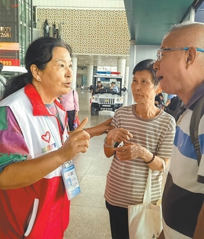廣州南站的每個(gè)角落唐偉都了然于心。她已經(jīng)在這里服務(wù)超過(guò)13個(gè)年頭,是志愿服務(wù)隊(duì)里年紀(jì)最大的一名“銀發(fā)”志愿者,人們親切地稱(chēng)呼她為“唐姨”。