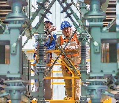 國網南京供電公司員工與南瑞集團工作人員在變電站查看設備狀態(tài)。杜 懿攝