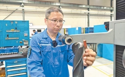 “是這里!”經(jīng)過(guò)檢查,陳國(guó)靖發(fā)現(xiàn),設(shè)備磨損導(dǎo)致扭力值不能滿足需求。他隨即從工具柜中取出備件,20秒便更換完畢,讓停滯的設(shè)備重新運(yùn)轉(zhuǎn)。