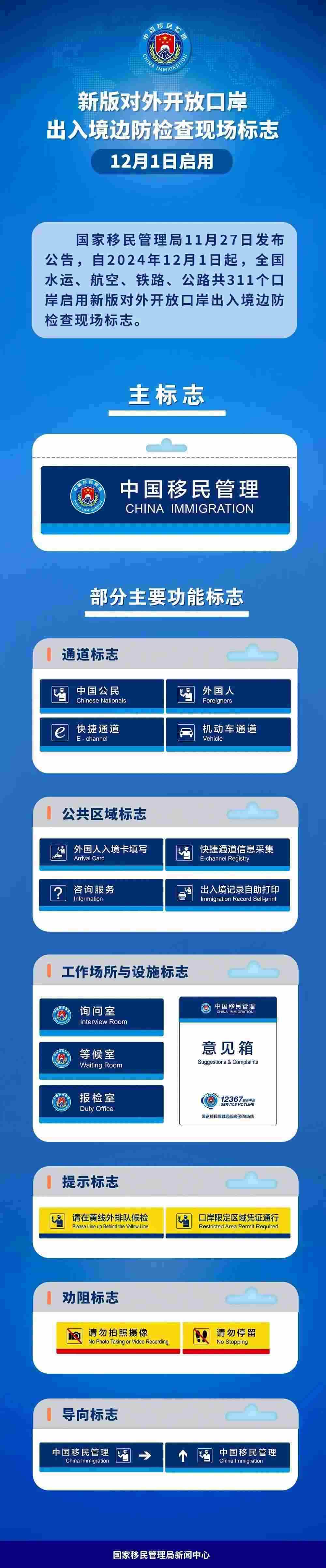 新版對外開放口岸出入境邊防檢查現(xiàn)場標(biāo)志分為主標(biāo)志和功能標(biāo)志兩類。主標(biāo)志是在對外開放口岸標(biāo)示出入境邊防檢查機(jī)關(guān)的標(biāo)志,由中國移民管理標(biāo)志和“中國移民管理”中英文字共同組成。其中,中國移民管理標(biāo)志已于2021年4月2日啟用。功能標(biāo)志是在對外開放口岸出入境邊防檢查現(xiàn)場標(biāo)示相關(guān)通道設(shè)施和提示導(dǎo)向的標(biāo)志,細(xì)分為6種70個,具體包括16個通道標(biāo)志,6個公共區(qū)域標(biāo)志,21個工作場所與設(shè)施標(biāo)志,9個提示標(biāo)志,9個勸阻標(biāo)志,9個導(dǎo)向標(biāo)志。