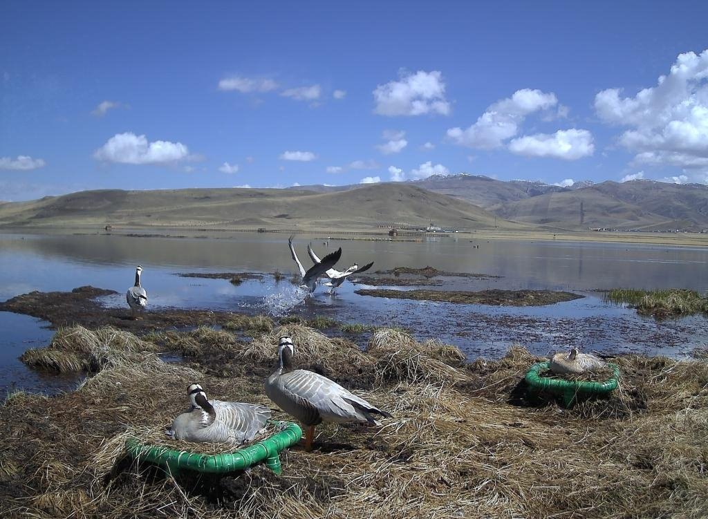 在甘肅尕海則岔國(guó)家級(jí)自然保護(hù)區(qū),棲息的斑頭雁通過(guò)人工鳥(niǎo)巢坐巢孵化后代(資料照片)。新華社發(fā)(甘肅尕海則岔國(guó)家級(jí)自然保護(hù)區(qū)管理局供圖)