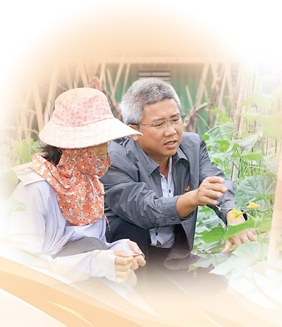 海南三亞市育才生態(tài)區(qū)那受村,駐村第一書(shū)記肖春雷(右)指導(dǎo)農(nóng)戶種植黃瓜。