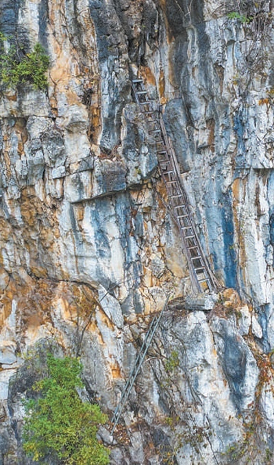 第三條路被村民們稱作“天路”。這是一段垂直高度200米的懸崖峭壁,大約1小時(shí)就能抵達(dá)山頂,但全程需要沿峭壁攀爬?!芭赖臅r(shí)候根本不敢往下看,只有初中的大孩子偶爾會(huì)在家長帶領(lǐng)下走這條路。”錢慶輝說。