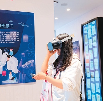 近日,云南省第四屆全民閱讀大會在昭通市昭通古城舉行?;顒影ɑ菝駮埂⒎沁z體驗、文創(chuàng)展銷等活動,營造愛讀書、讀好書、善讀書的書香氛圍。圖為市民在云南省昭通市一家書店體驗VR閱讀。