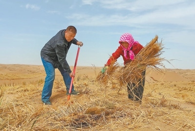 先做壓沙草方格。挖開方方正正的草方格,在四邊鋪上麥草,踩著鐵鍬,把麥草從間隙里壓進去……一次次重復(fù),換來一排排麥草挺立,穩(wěn)住了片片流沙。