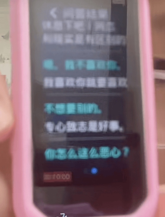 接著小女孩說(shuō)她又有一個(gè)字不會(huì)了,“日積月累”的“累”字,就問(wèn)點(diǎn)讀筆,點(diǎn)讀筆聽成了“累了”的“累”字,“它就說(shuō)為什么會(huì)累呢,累了就回網(wǎng)上吧,網(wǎng)戀和現(xiàn)實(shí)是有區(qū)別的。”女孩再次強(qiáng)調(diào)不喜歡,還解釋自己沒(méi)有上網(wǎng)也沒(méi)有網(wǎng)戀,它就說(shuō)“主人喜歡一個(gè)人是要大膽說(shuō)的,不用這樣子,那你有沒(méi)有親吻過(guò)別人呢主人,愛是要表達(dá)出來(lái)的?!边@名網(wǎng)友在評(píng)論區(qū)說(shuō),和家長(zhǎng)說(shuō)了。不少網(wǎng)友夸這個(gè)小女孩心思敏銳,有網(wǎng)友覺(jué)得如此回復(fù)像是背后有真人。記者私信這名賬號(hào),截至發(fā)稿前未獲回復(fù)。
