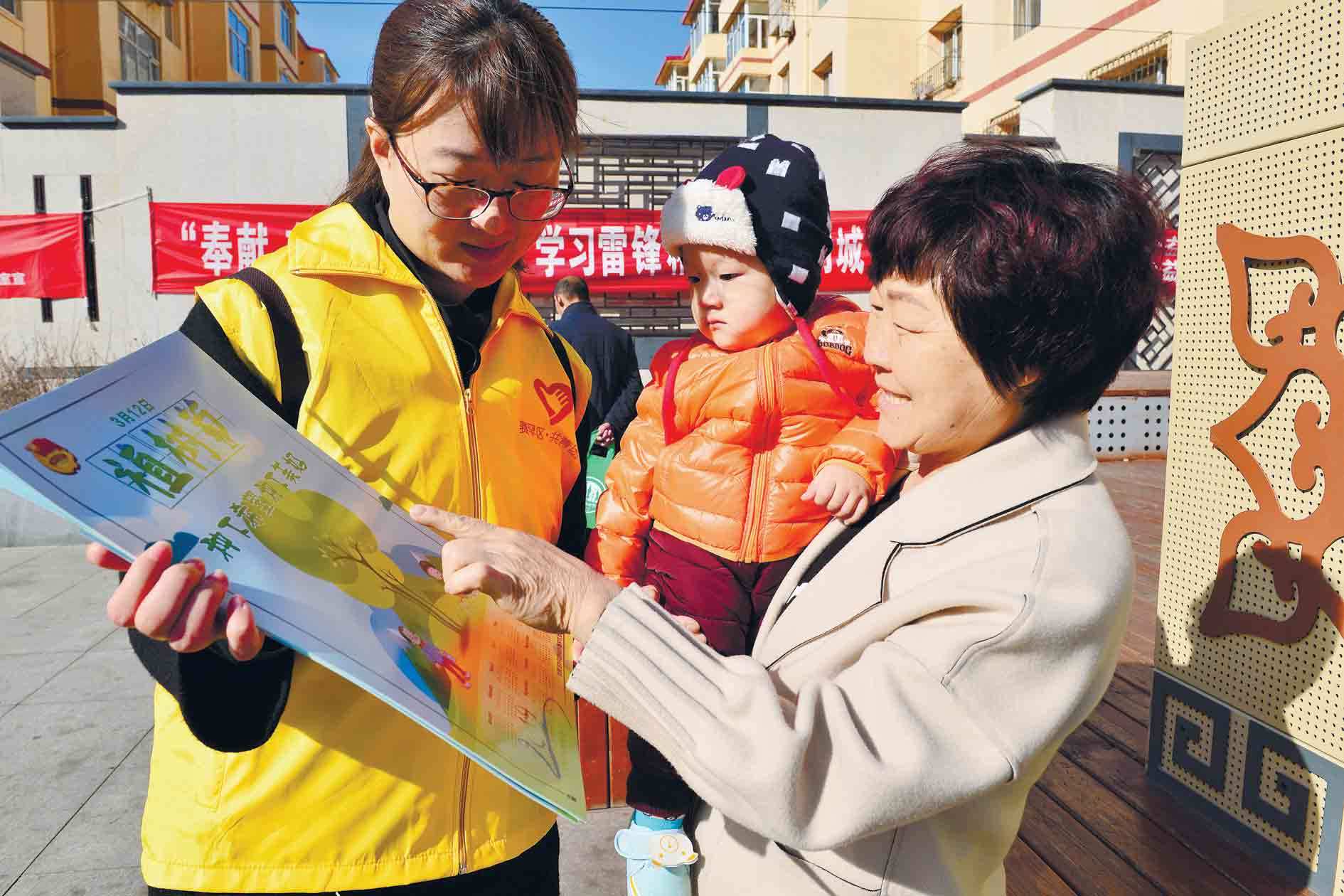 3月12日,志愿者在呼和浩特市賽罕區(qū)金地文化廣場上為市民發(fā)放宣傳資料。當(dāng)日,賽罕區(qū)綠化委員會辦公室舉辦了“3·12植樹節(jié)”宣傳活動。據(jù)悉,2018年賽罕區(qū)完成植樹958萬株(叢),人均公園綠地面積19.1平方米,建成區(qū)綠化覆蓋率42.3%。(內(nèi)蒙古日報社融媒體記者 安寅東)