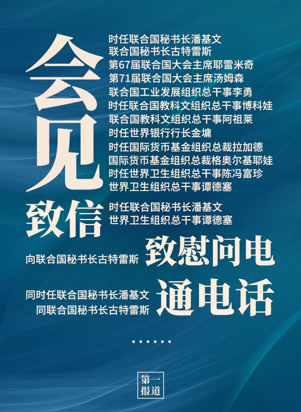 2013年以來,習(xí)主席通過會見、通話、致信函等多種方式同聯(lián)合國主要官員保持密切溝通。互動對象包括聯(lián)合國秘書長、聯(lián)合國大會主席,還有聯(lián)合國工業(yè)發(fā)展組織、聯(lián)合國教科文組織、世界銀行、國際貨幣基金組織、世界衛(wèi)生組織等聯(lián)合國專門機構(gòu)主要負責(zé)人。