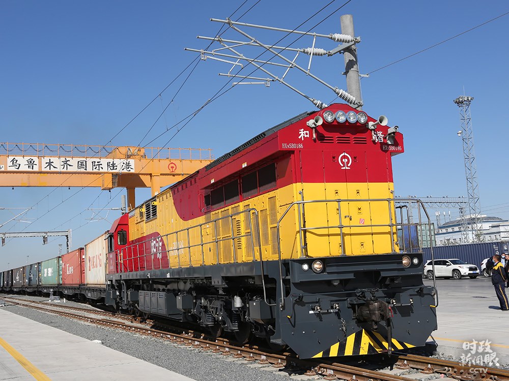 △9月8日,烏魯木齊國(guó)際陸港區(qū),一列滿載日用品的中歐班列啟程。