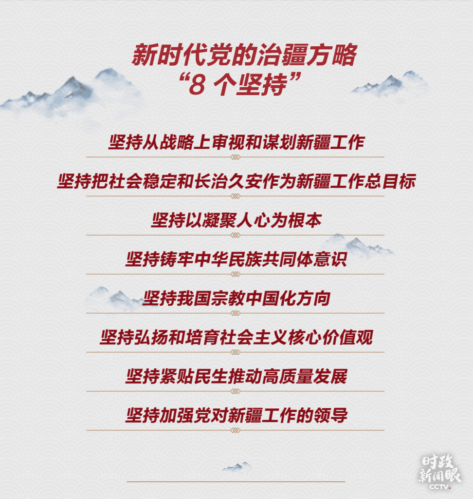 《時(shí)政新聞眼》發(fā)現(xiàn),時(shí)隔六年,“依法治疆、團(tuán)結(jié)穩(wěn)疆、長(zhǎng)期建疆”擴(kuò)充為了“依法治疆、團(tuán)結(jié)穩(wěn)疆、文化潤(rùn)疆、富民興疆、長(zhǎng)期建疆”,但“依法治疆”始終擺在第一位。