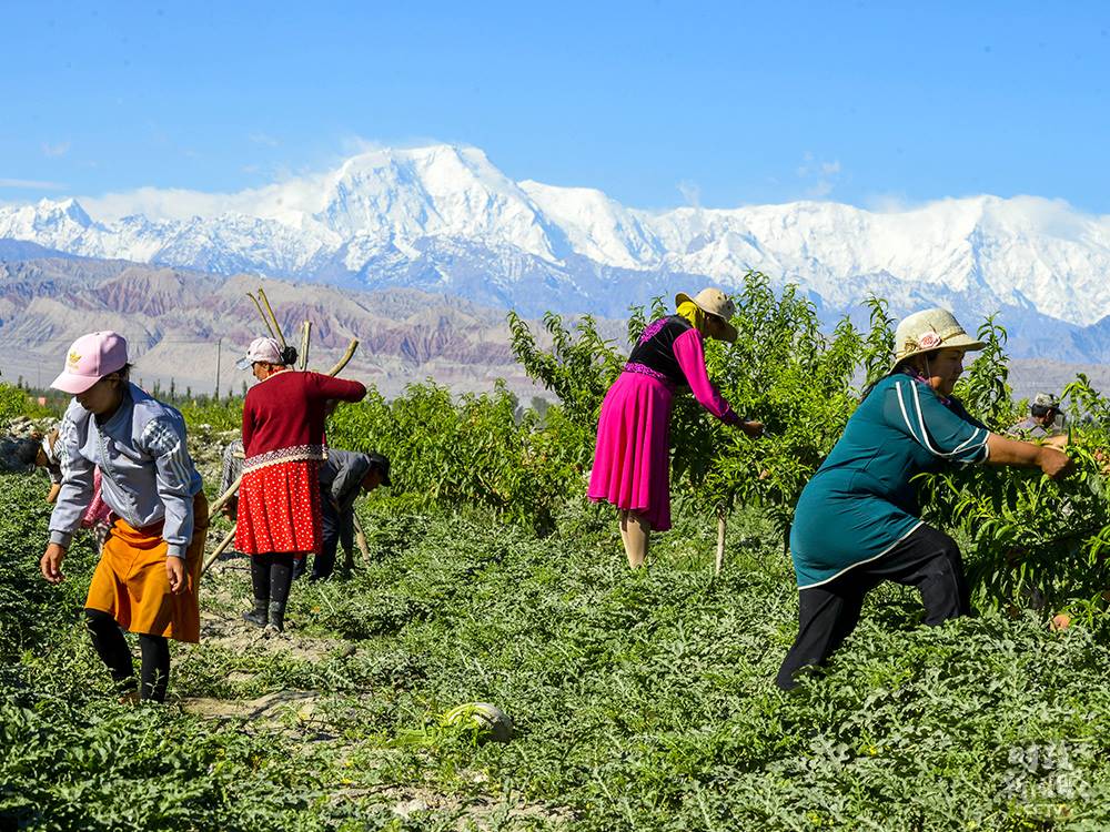 △新疆阿克陶縣村民在林果基地為桃樹(shù)打枝,林間同時(shí)套種了西瓜。