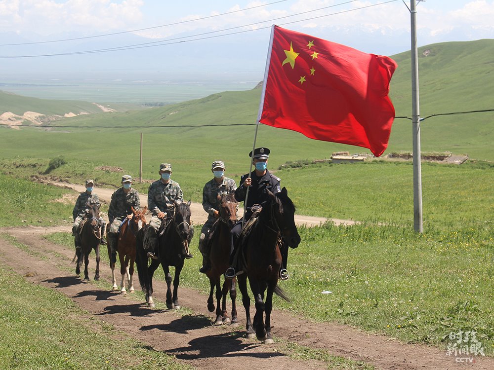 △新疆伊犁昭蘇縣洪土溝邊境檢查站民警和護(hù)邊員在邊境線踏查。