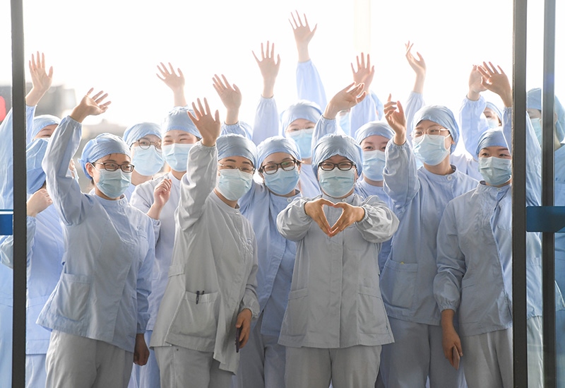 2020年3月23日,武漢市第一醫(yī)院部分醫(yī)護(hù)人員在武漢天河機場為廣東第14批援鄂醫(yī)療隊送行