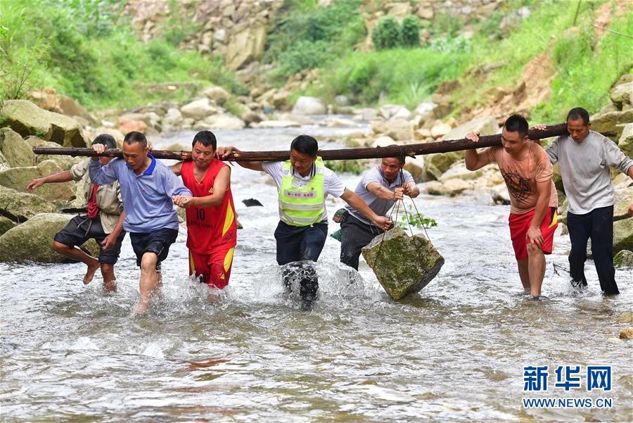 在位于黔桂交界大苗山深處的烏英苗寨,駐村第一書記韋桂華(右四)、黨員梁成兵(右三)、梁志新(左二)帶領(lǐng)村民維修河堤(2019年6月30日攝)。新華社記者黃孝邦攝