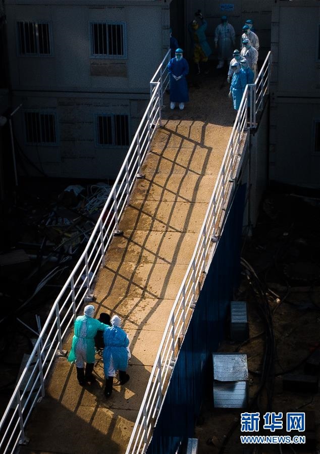 醫(yī)護人員將患者送入武漢火神山醫(yī)院病房(2020年2月4日攝,無人機照片)。新華社記者肖藝九攝