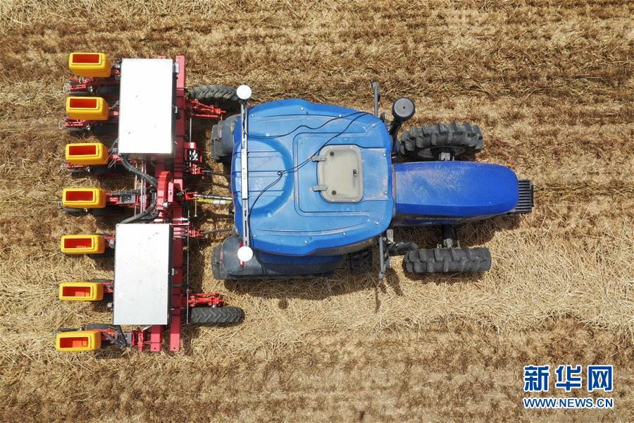 在河南省鄧州市小楊營鎮(zhèn)安眾村,加裝有北斗導(dǎo)航系統(tǒng)的拖拉機在無人駕駛狀態(tài)下播種(2020年5月26日攝,無人機照片)。新華社記者馮大鵬攝