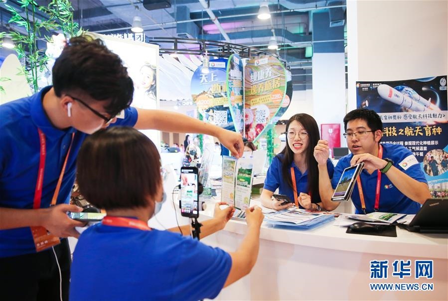 在2020年中國國際服務(wù)貿(mào)易交易會旅游服務(wù)專題展區(qū),中國旅游集團展位的工作人員通過直播向線上觀眾介紹旅游服務(wù)產(chǎn)品(2020年9月5日攝)。新華社記者潘思危攝