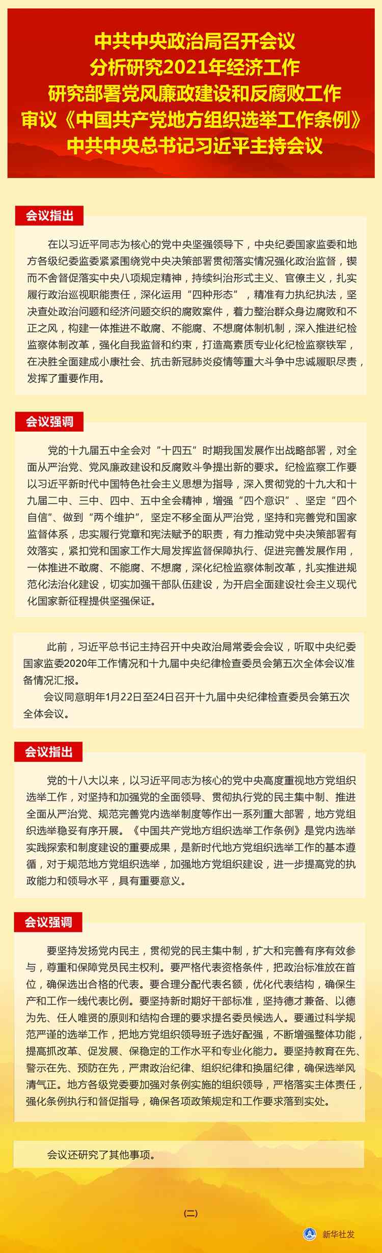 新華社北京12月11日電 中共中央政治局12月11日召開會議,分析研究2021年經(jīng)濟工作;聽取中央紀委國家監(jiān)委工作匯報,研究部署2021年黨風廉政建設(shè)和反腐敗工作;審議《中國共產(chǎn)黨地方組織選舉工作條例》。中共中央總書記習近平主持會議。